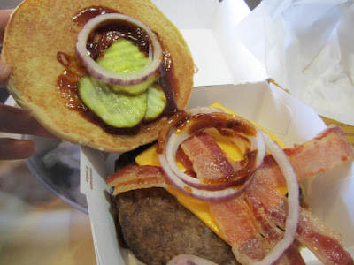 On the plus side: Reviews I had read, didn't care for the limp bacon. This burger had crispy bacon and it wasn't burnt either. The pickles were thick crinkle cut slices - a better grade of pickles than the burgers on the Dollar Menu. I was impressed too with the bun, a nice wheatier bread than the McRib or the Big Mac.